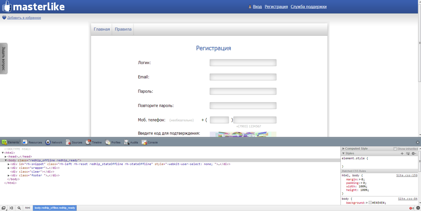 Давайте подробнее рассмотрим что мы можем здесь заполнить автоматически, это будут все поля кроме поля ввода кода подтверждения так как он всегда разный! Теперь необходимо определить имена полей которые мы заполняем, для этого открываем браузер Chrome и переходим на нашу страничку www.masterlike.ru,после полной загрузки страницы нажимаем «F12». У нас появится дополнительное окно: